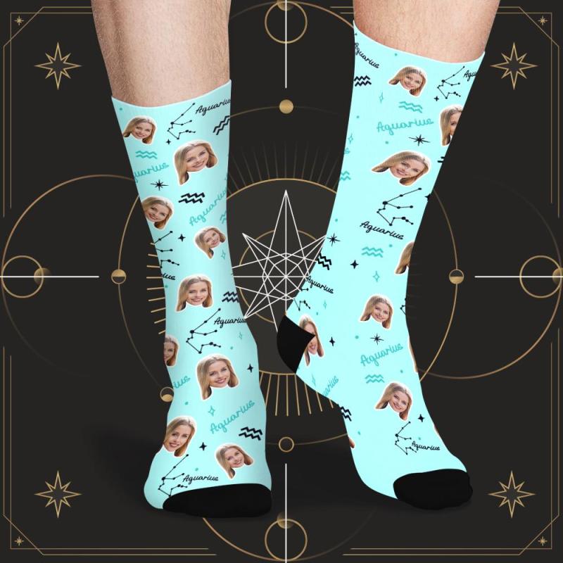 Chaussettes Porte-bonheur Verseau Personnalisées, Visage Personnalisé, Chaussettes Porte-bonheur Constellation Exclusives