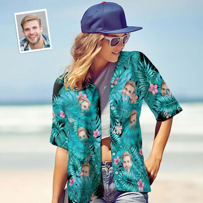Chemise Visage Personnalisée Photo Personnalisée Chemise Hawaïenne Pour Femme Cadeau - Feuilles Et Fleurs Roses