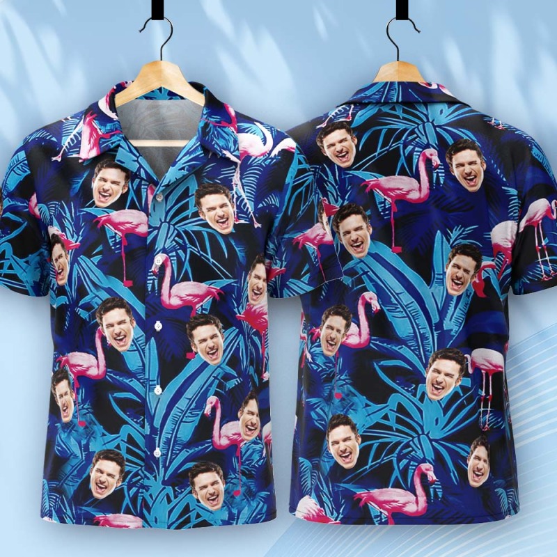 Chemise Hawaïenne Avec Visage Personnalisé, Chemise Hawaïenne Avec Photo De Flamant Rose À Feuilles Bleues