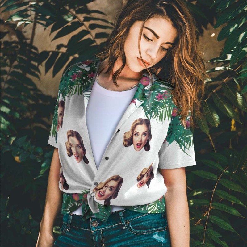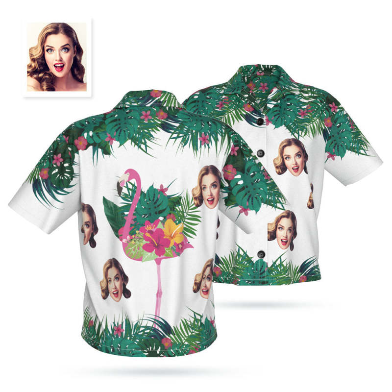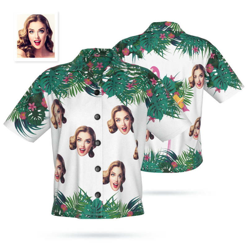 Chemise Hawaïenne Visage Personnalisée Pour Femme Chemise Photo Femme Personnalisée Verdure Et Flamant Rose