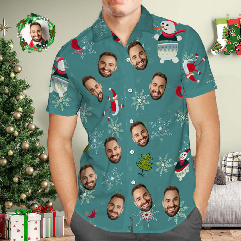 Chemise Hawaïenne Avec Visage Personnalisé, Flocons De Neige Et Bonhommes De Neige, Chemises Hawaïennes Vertes, Cadeau De Noël Pour Lui