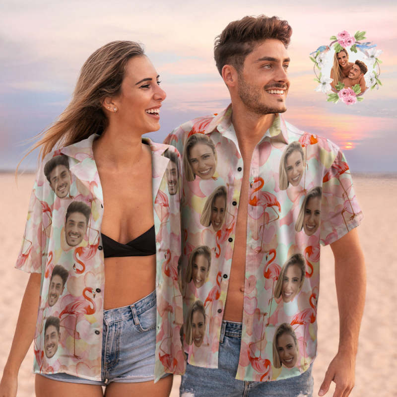 Chemises Hawaïennes De Visage Personnalisées Chemises Hawaïennes De Couple De Flamants Roses Personnalisées Cadeau De La Saint-valentin