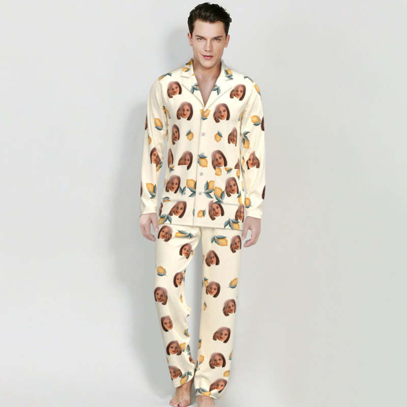 Visage Personnalisé À Manches Longues Bouton Vers Le Bas Vêtements De Nuit Personnalisé Photo Pyjamas Citron Imprimé Fleuri Cadeau Pour Les Amis