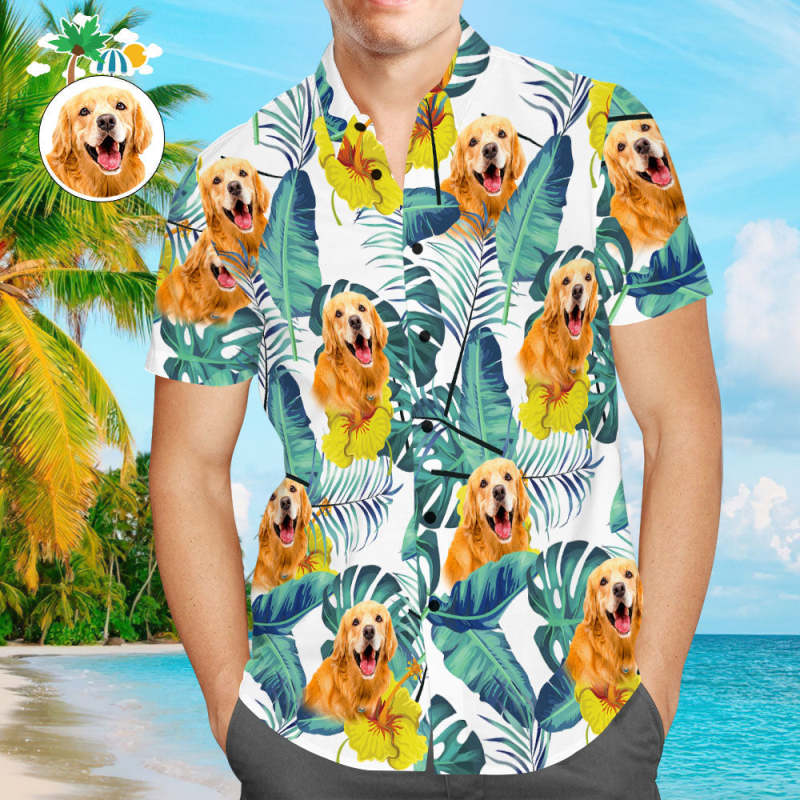 Chemise Hawaïenne Personnalisée Pour Hommes Face Mignon Visage De Chien Personnalisé Pour Les Amateurs D'Animaux De Compagnie - Feuilles Vertes