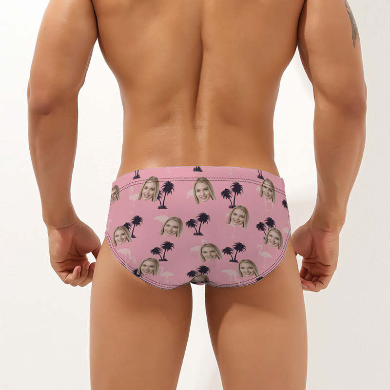 Maillot De Bain Pour Homme Avec Visage Personnalisé Slip De Bain À Imprimé Cocotier Et Flamant Rose