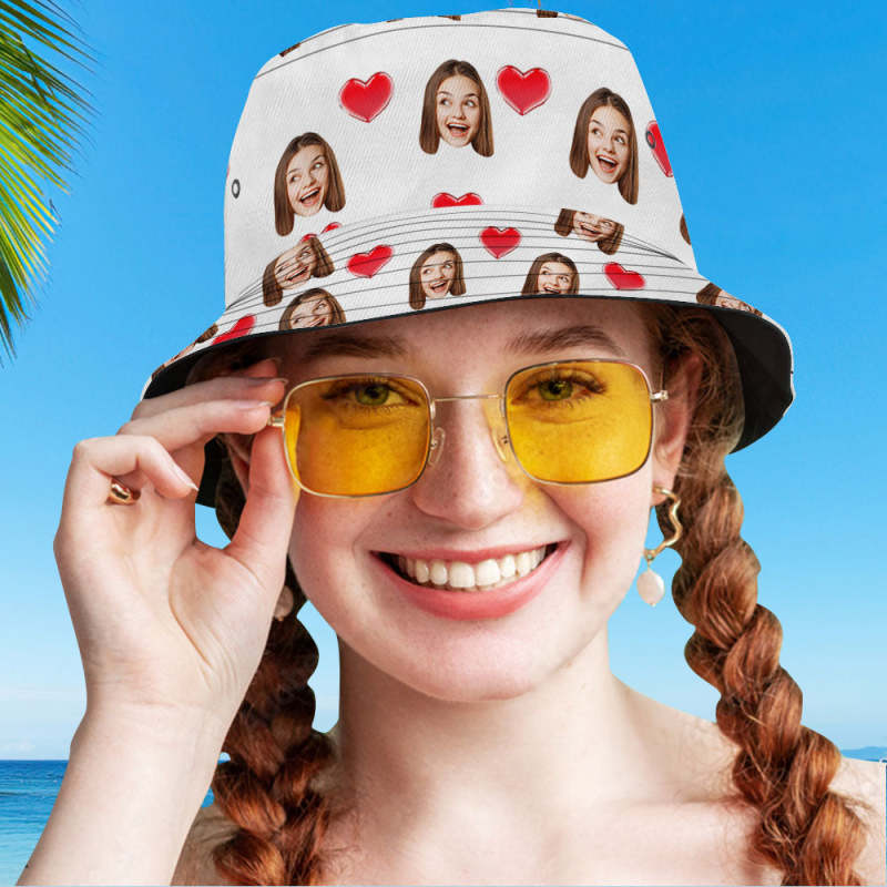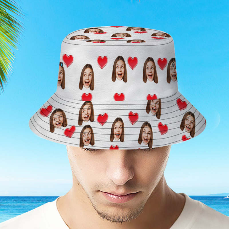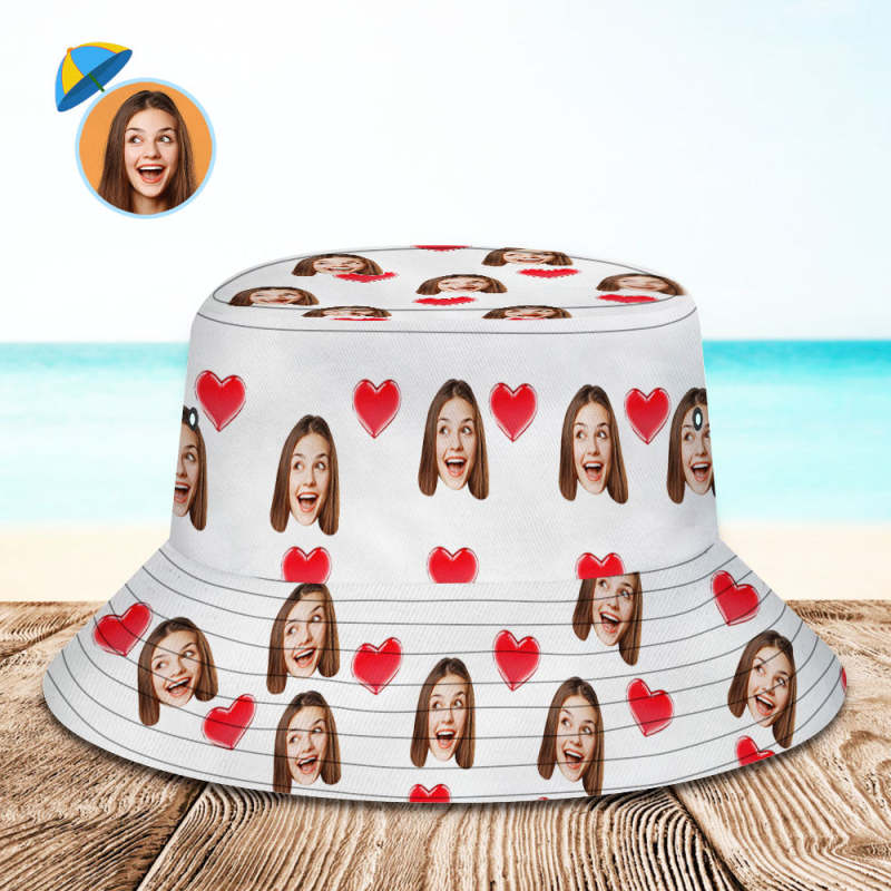 Chapeau de pêcheur d'été personnalisé avec votre photo visage et animal de compagnie - Coeur Blanc