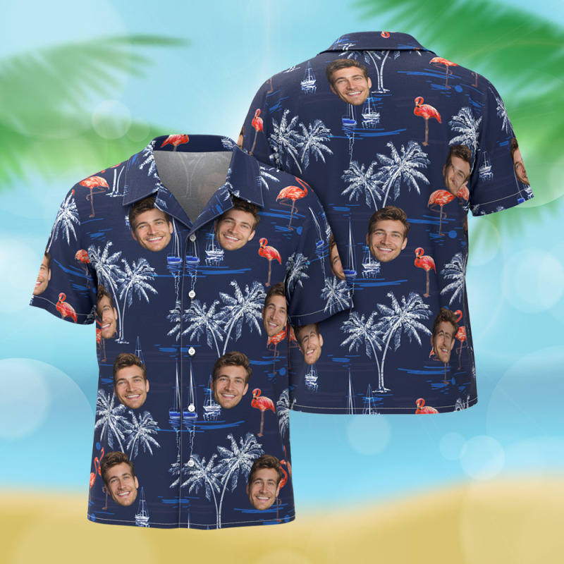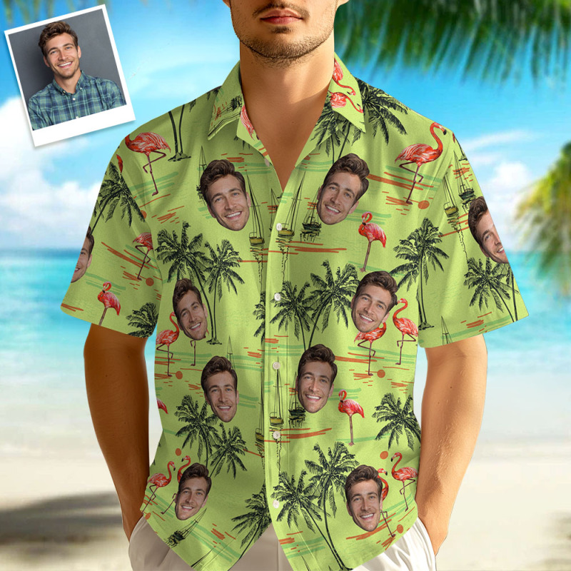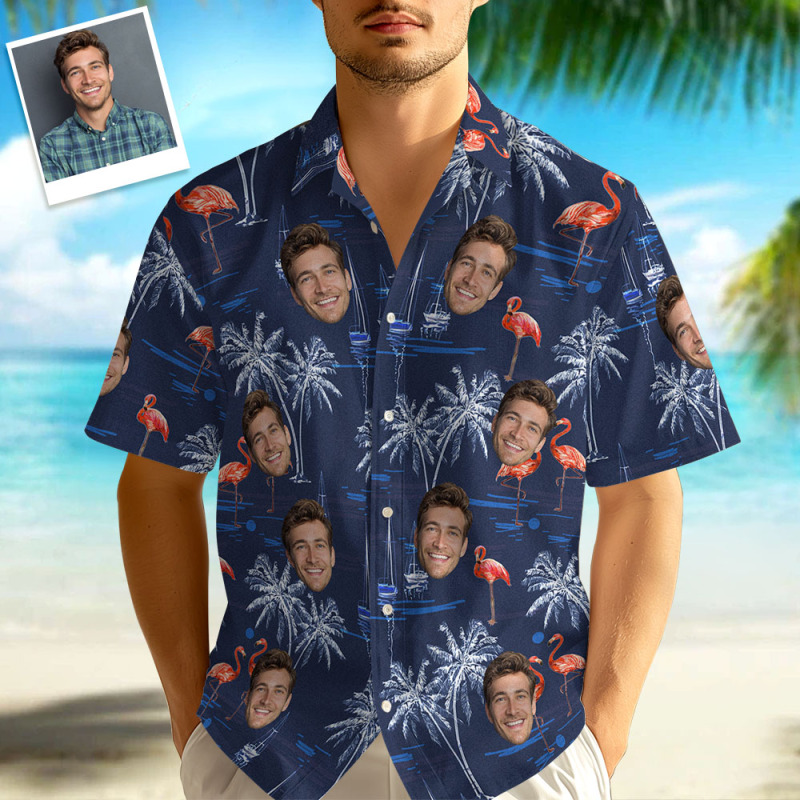 Chemises Hawaïennes Avec Visage Personnalisé Pour Hommes, Chemises Avec Imprimés Flamants Roses Et Plage, Cadeaux Pour Hommes