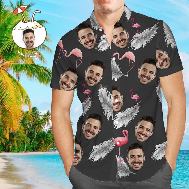 Chemise Visage Personnalisée Homme Chemise Hawaïenne Manches Courtes Plume Et Flamant Rose Noir