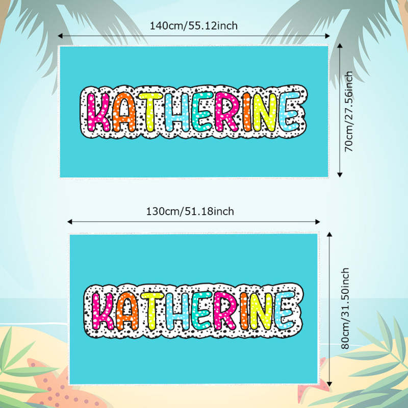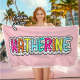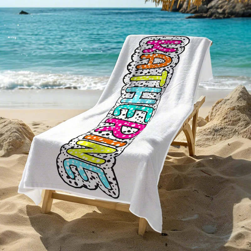 Cette serviette de plage personnalisée à pois dalmates est l'accessoire idéal pour les vacances d'été. Il comporte un nom arc-en-ciel vibrant qui ajoute une touche unique.