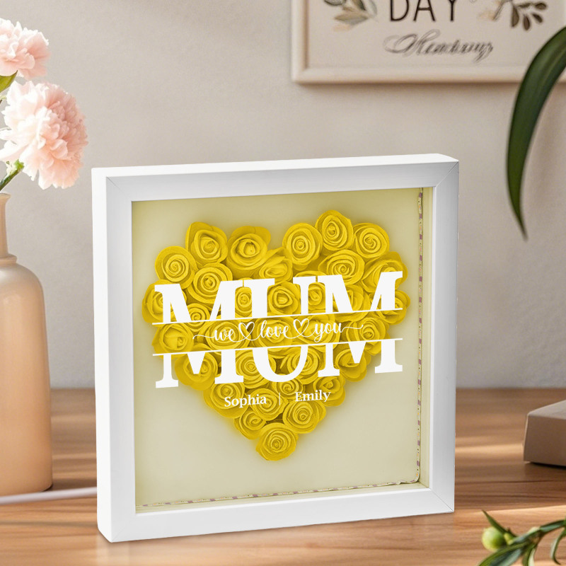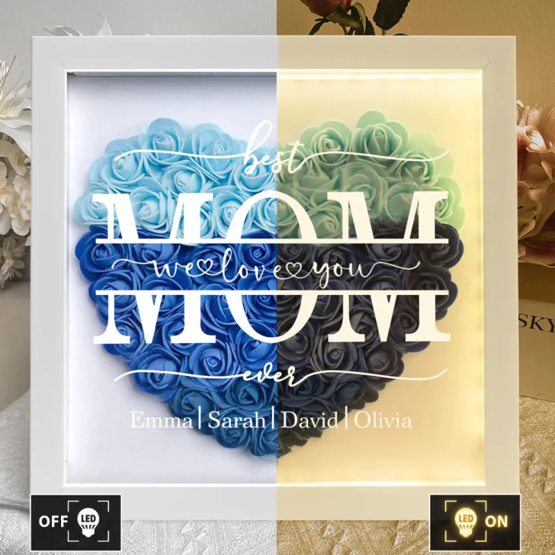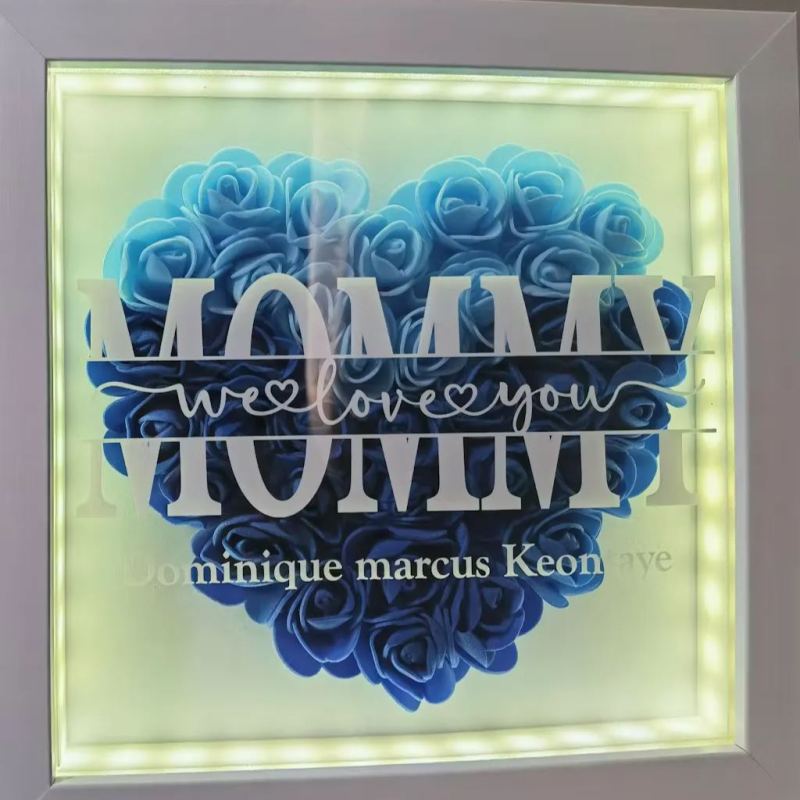 Cette boîte à fleurs personnalisée avec lumière LED est La façon idéale d'exprimer votre amour et votre reconnaissance à maman pour la fête des Mères. Avec sa citation et ses prénoms personnalisables, cette magnifique boîte-cadeau associe l'élégance de motifs floraux délicats à la douce lumière LED, créant un souvenir réconfortant qu'elle chérira à jamais. Qu'elle soit exposée sur une étagère, une table de chevet ou dans le salon, elle rappellera constamment l'amour et la gratitude partagés entre une mère et ses enfants. Conçu avec soin pour capturer la beauté et la chaleur de la maternité, ce cadeau unique est parfait pour que maman se sente vraiment spéciale. Surprenez-la avec un hommage unique à son amour et à son attention indéfectibles qui illumineront sa journée, au sens propre comme au sens figuré.